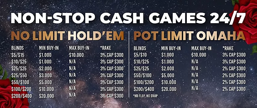 No Merit acontece regularmente um cash game caro, e este festival não será exceção. No Hold’em, o jogo começa em 5/15; em Omaha, em 5/10. Aqui estão os limites e rake cobrado: