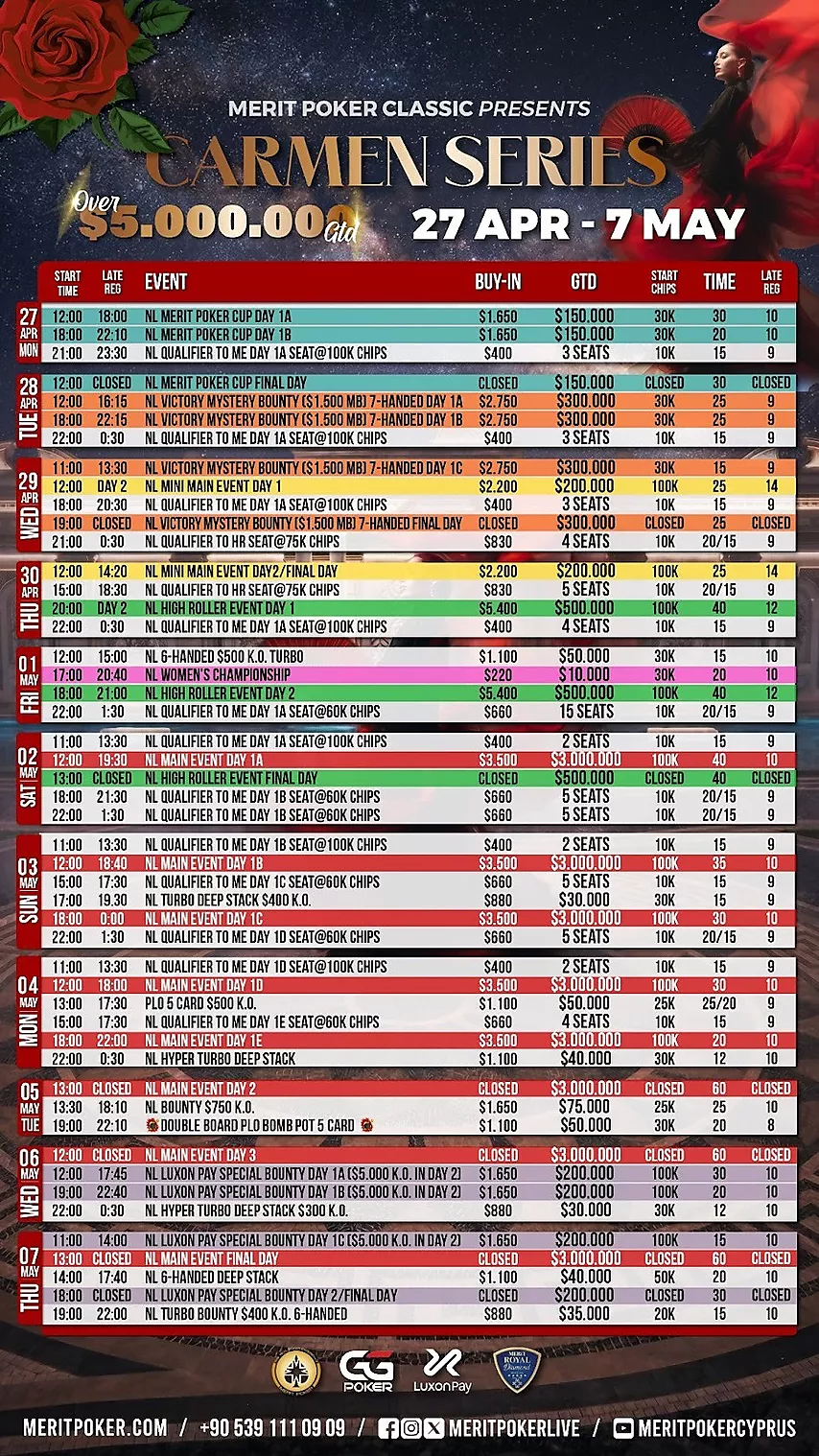 No fim de abril e durante os feriados de maio, o Merit Poker espera todos no Chipre do Norte. O enorme salão do Merit Royal Diamond já recebeu séries de nível mundial: etapas da Triton, WSOP, EPT e MPP — e em breve será realizada aqui a conceitual série Carmen. Na programação, são onze dias de torneios, nos quais se combinam buy-ins acessíveis e garantias incríveis.