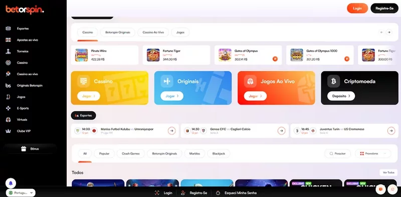 Além das apostas esportivas, o BetorSpin oferece uma seção de cassino online bastante interessante, recheada de opções para quem curte slots e jogos de mesa. Atualmente, o catálogo conta com mais de 5.000 jogos de cassino, abrangendo desde as clássicas máquinas caça-níqueis até modalidades modernas de jogos ao vivo. Apesar de não ser o maior portfólio do mercado, essa variedade é suficiente para manter a maioria dos jogadores entretida, com títulos de diversas temáticas e estilos. A plataforma fez parceria com provedores de software reconhecidos internacionalmente – você encontrará jogos de fornecedores como: Pragmatic Play, PG Soft, PopOK Gaming, KA Gaming, Hacksaw Gaming, entre outros estúdios emergentes. Graças a isso, os jogos oferecem qualidade gráfica, boa jogabilidade e resultados justos (RNG auditado pelos fornecedores).