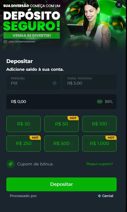 O valor mínimo de depósito é baixo, R$ 5, facilitando que novos usuários testem o site sem gastar muito. Os depósitos são instantâneos.