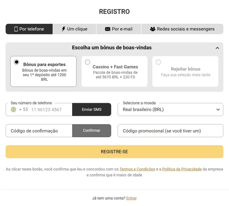Para criar uma conta na MelBet basta acessar o site oficial, depois clique em “Cadastro”, na parte superior direita do navegador. O registro pode ser feito por: