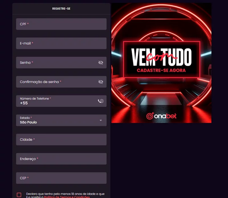 Para criar sua conta na Onabet, acesse o site oficial e clique em "Registre-se" (botão vermelho no canto superior esquerdo), depois siga os seguintes passos: