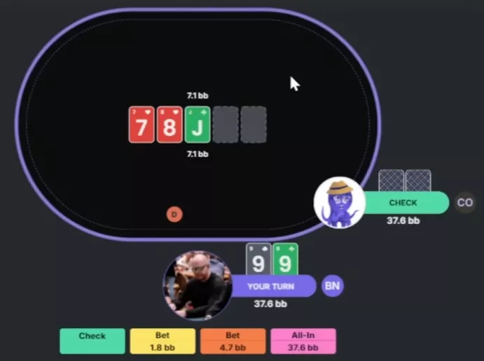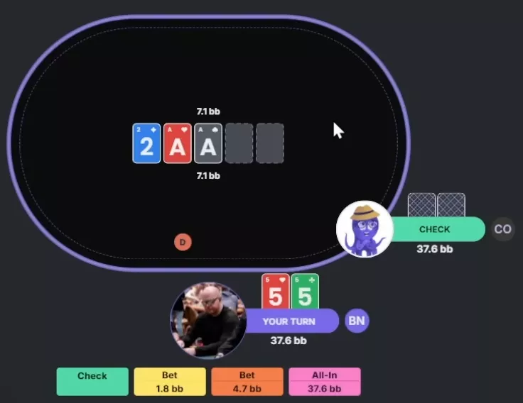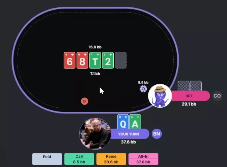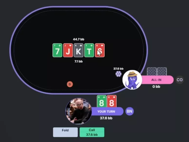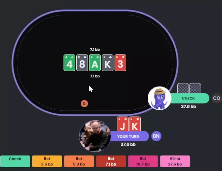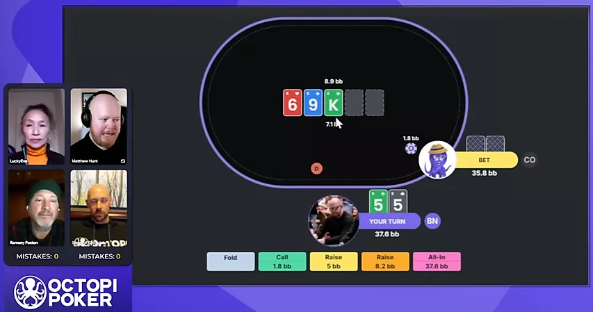 Permitam-me explicar as regras desta rodada. Assim como da última vez, vamos jogar contra George, nosso polvo que joga conforme o solver. Os jogadores farão suas jogadas em sequência, um depois do outro. Vence quem restar. Para ser eliminado, o participante precisa cometer um erro grave ou três erros comuns. Não vamos ser exigentes demais: se o solver considerar determinada ação um erro, mas indicar que ela não perde EV, não vamos contá-la como erro.