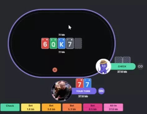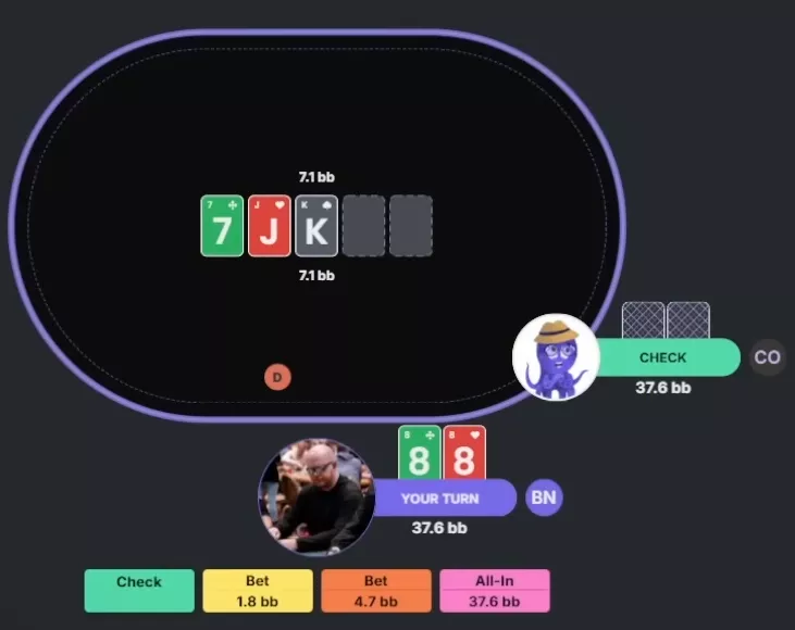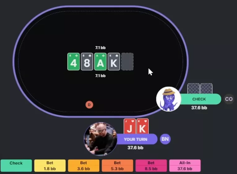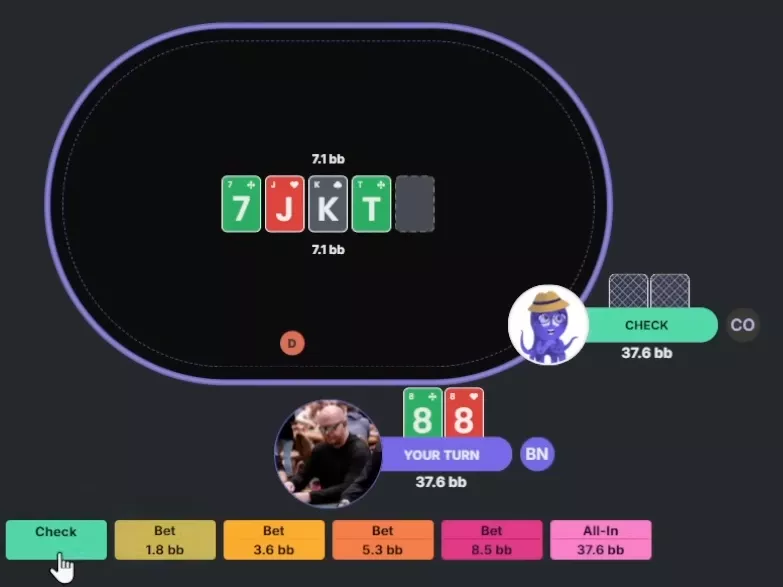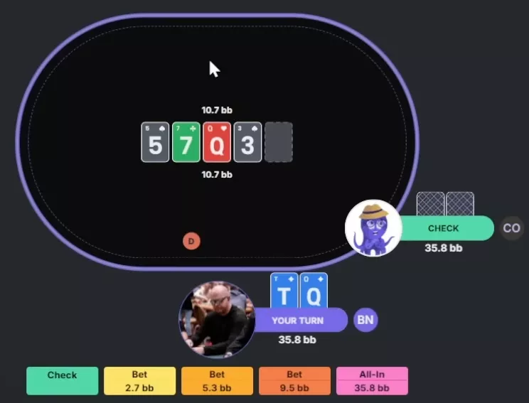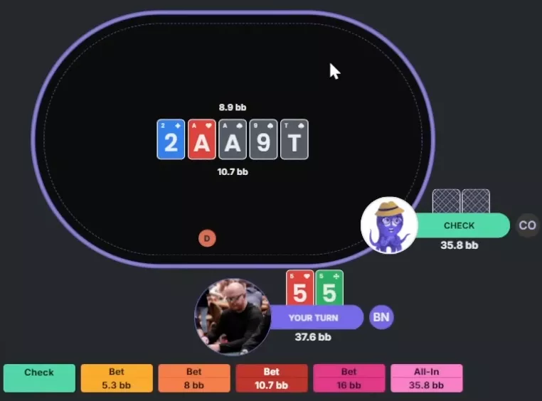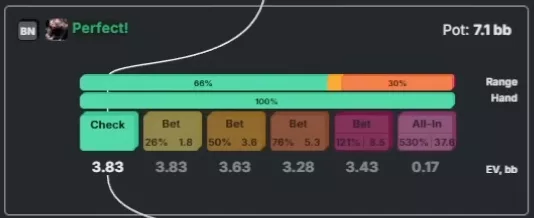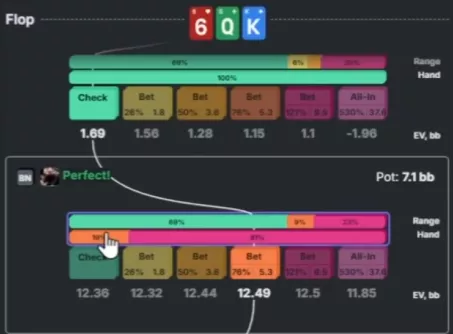 Apresentador: Correto. O solver faz mix entre check e uma aposta pequena, mas checka com mais frequência, tanto com o range quanto com a mão específica. Já com seria quase um bet puro.