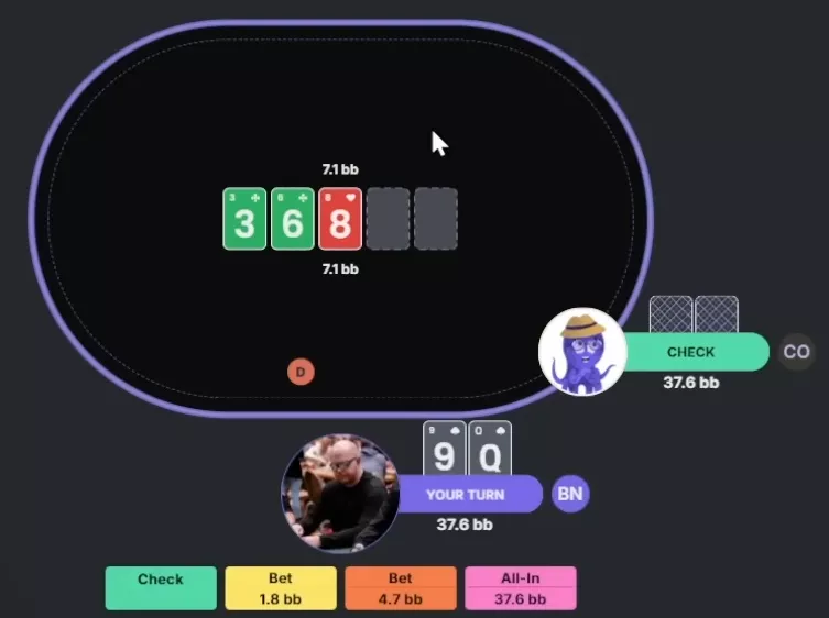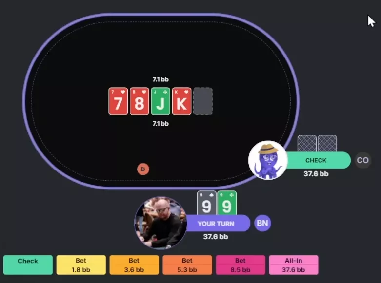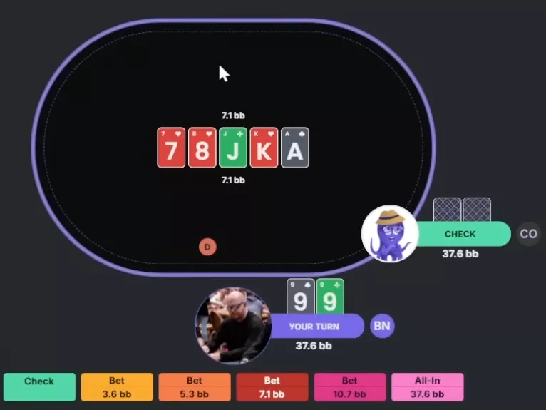 Chidwick: Pelo visto, podemos apostar maior, aproximando-nos de um sizing geométrico — para que uma aposta com a mesma proporção no river leve ao all-in. O check também é razoável, mas eu vou ficar com a aposta grande: 9.5 bbs.
