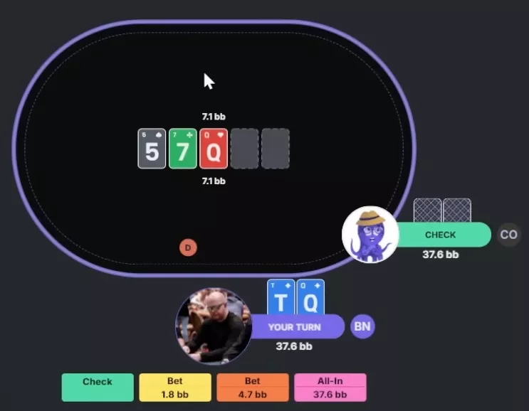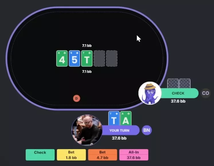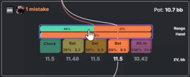 Apresentador: Com essa combinação específica, é um mix exato de 50/50 entre check e aposta de 4.7 bbs, então você está absolutamente certo.