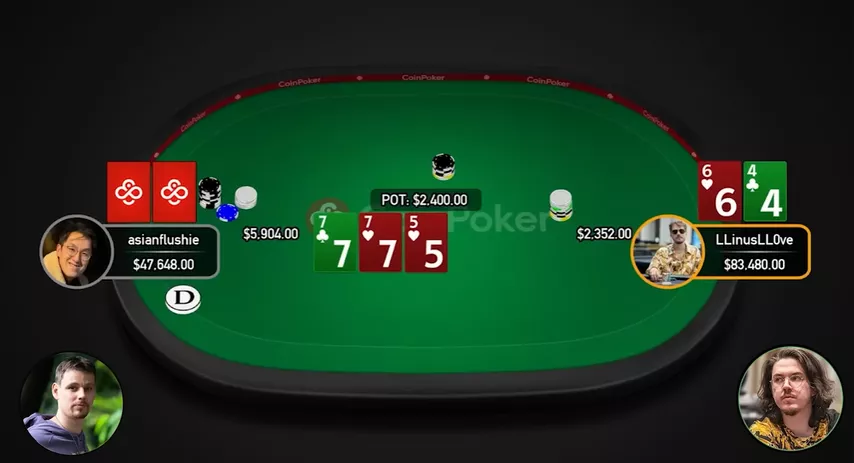 Adorei essa mão. Quero destacar novamente que Linus tinha o — pra mim, isso é um sinal de alerta, mas é possível que ele tenha levado isso em conta e, mesmo assim, tenha decidido seguir essa linha. Isso mostra o quanto ele confia no próprio jogo. Mas Flushie estava um passo à frente.
