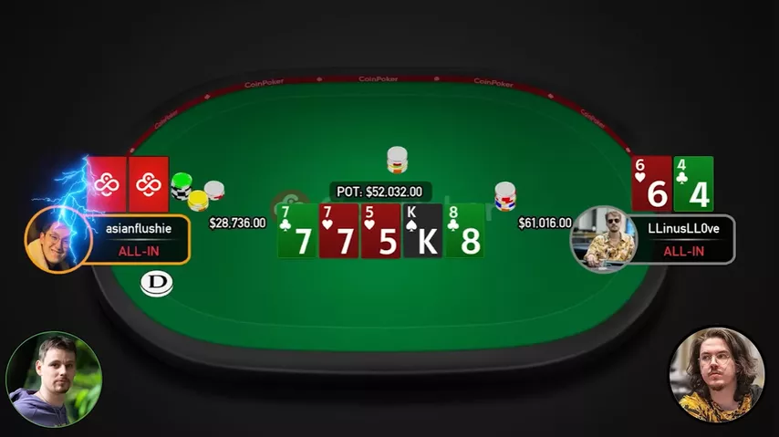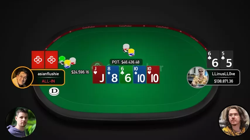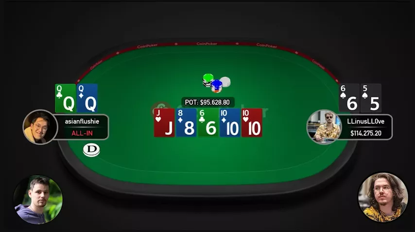 — Linus ainda pode perder para um full house, mas, por exemplo, o Flushie não pode ter aqui. A única possibilidade é , mas nós temos o .