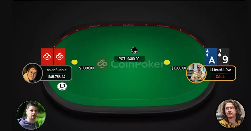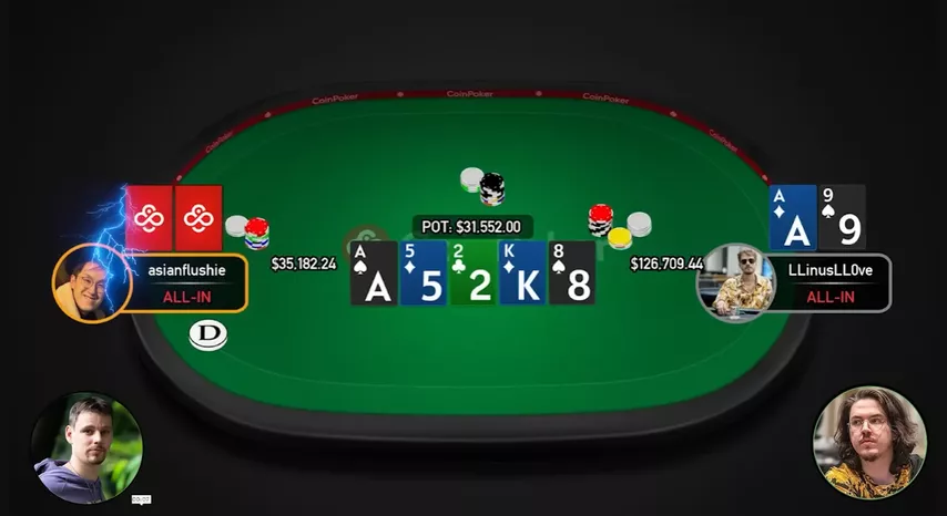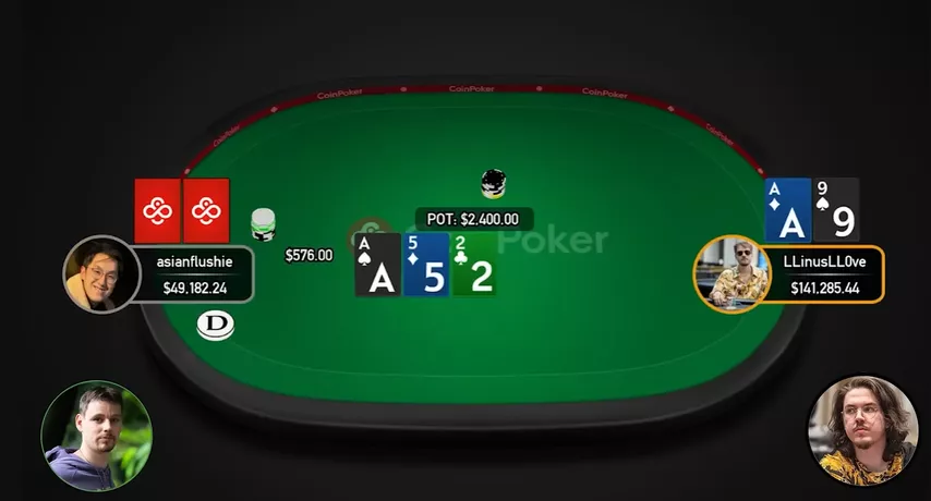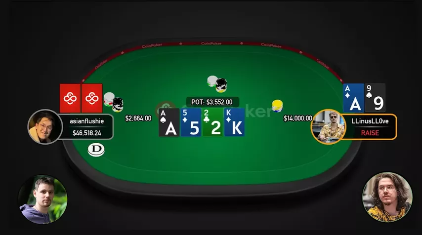 — Linus realmente acertou o ás. Flushie fez uma c-bet do mesmo tamanho da mão anterior, e Linus pagou.