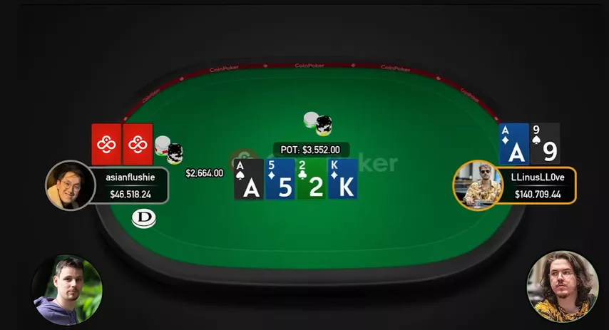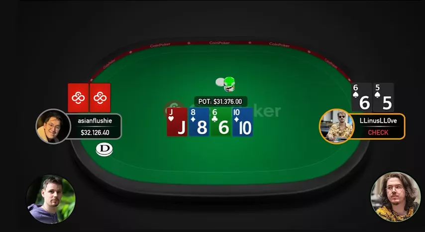 De modo geral, um check-call do Linus nessa situação seria mais um exploit, e não uma linha ditada pelo solver. Esse match é o verdadeiro Velho Oeste do poker — impossível de analisar sob uma ótica puramente GTO. Tudo muda radicalmente a cada mão.