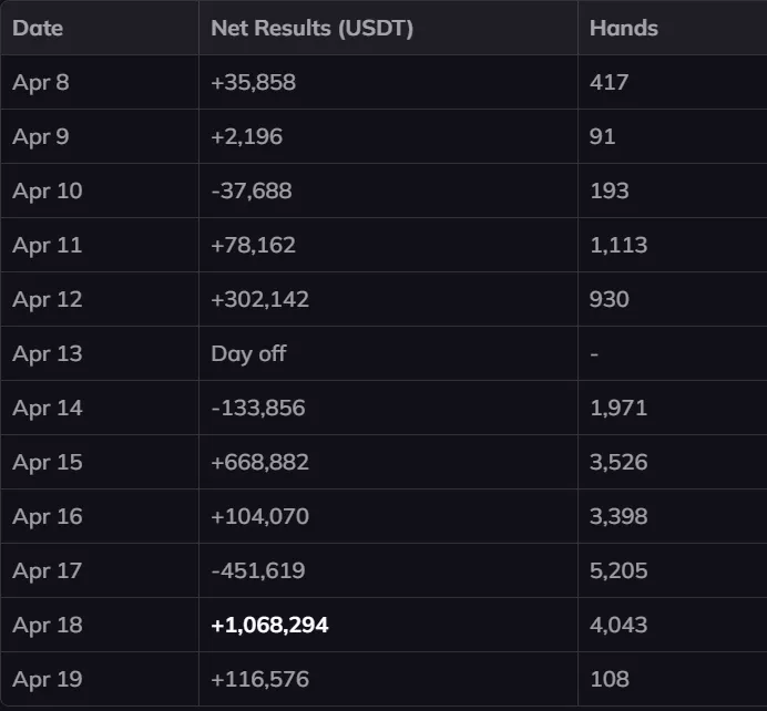 Em 10 dias, Viktor jogou 20.995 mãos. Seu melhor resultado foi +$1,075 milhão em um único dia, enquanto, no pior dia, perdeu $451k.