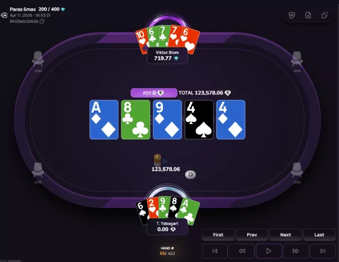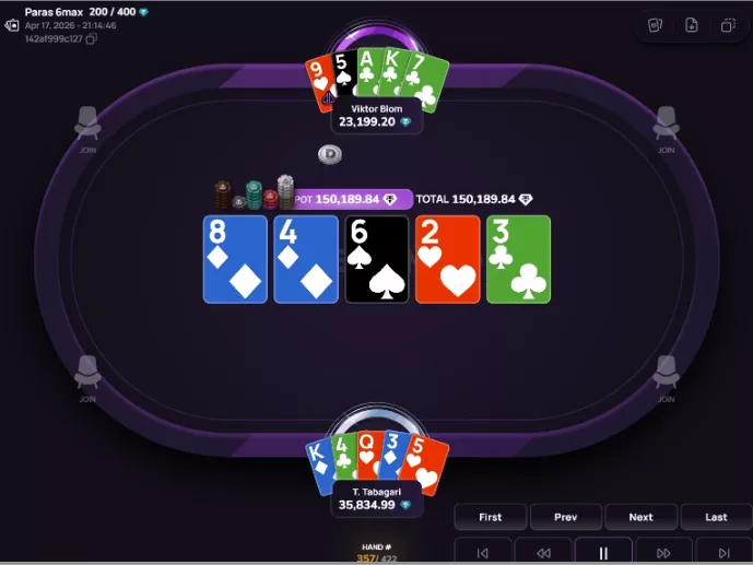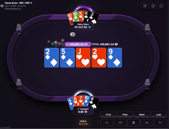 Blom aplicou 3-bet e deu c-bet de 4.747 no flop. No turn, continuou a agressão com uma aposta de 16.687, Teimurazi respondeu com shove de 53.445, Viktor pagou, mas não melhorou no river.