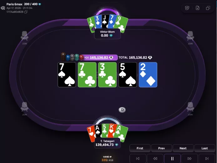 Viktor deu call em uma 4-bet de 10.800. No flop, ele acertou full house e jogou de check-raise: 7.125 para 21.500. Teimurazi pagou. No turn, Isildur foi all-in, Tabagari deu call e mostrou um full house maior.