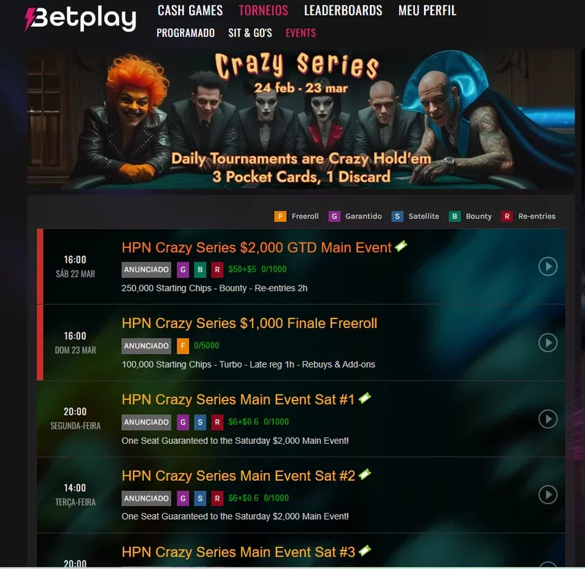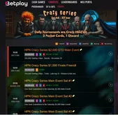 A última série organizada pela BetPlay, a Betplay Poker Crazy Hold 'Em Series foi jogada nos meses de fevereiro e março de 2025, garantido $18.000 em prêmios. A série contou com freerolls (um deles com $1.000 em prêmios), torneios micro-stakes e um Main Event de $50 com $2.000 garantidos.
