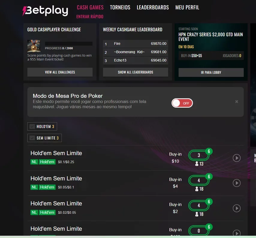 Para jogar poker na BetPlay, você deve fazer o login no site e clicar no botão “pôquer”, localizado na área superior central. Uma nova página irá se abrir com o lobby de poker da plataforma.