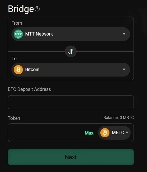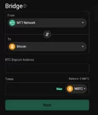 O caixa inclui um recurso chamado "Bridge", que abre uma janela para transferir tokens entre Ethereum, Bitcoin e a MTT Network. Isso permite transferir Bitcoin da MTT Network para a rede Bitcoin convencional. Antes de usar essa funcionalidade, será necessário realizar uma nova verificação: