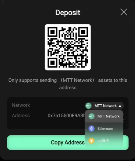 Você pode carregar sua conta do MTT Sports transferindo criptomoedas via MTT Network, Ethereum ou opBNB. Essas mesmas opções estão disponíveis para saques. É importante verificar qual rede você está usando, pois um erro pode resultar na perda dos fundos: