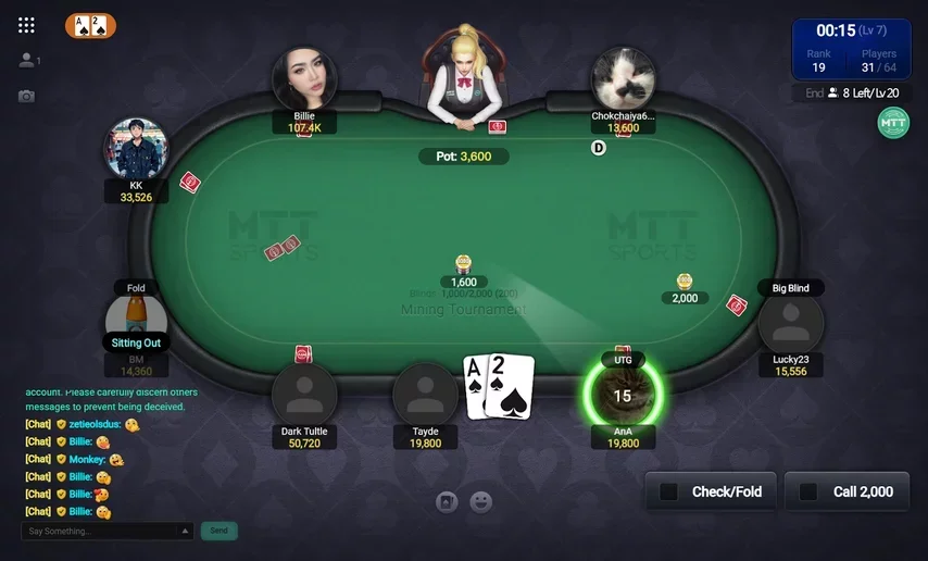 A sala de poker do MTT Sports oferece uma impressionante seleção de torneios de poker, voltados principalmente para jogadores que estão aprendendo a jogar e querem praticar torneios.