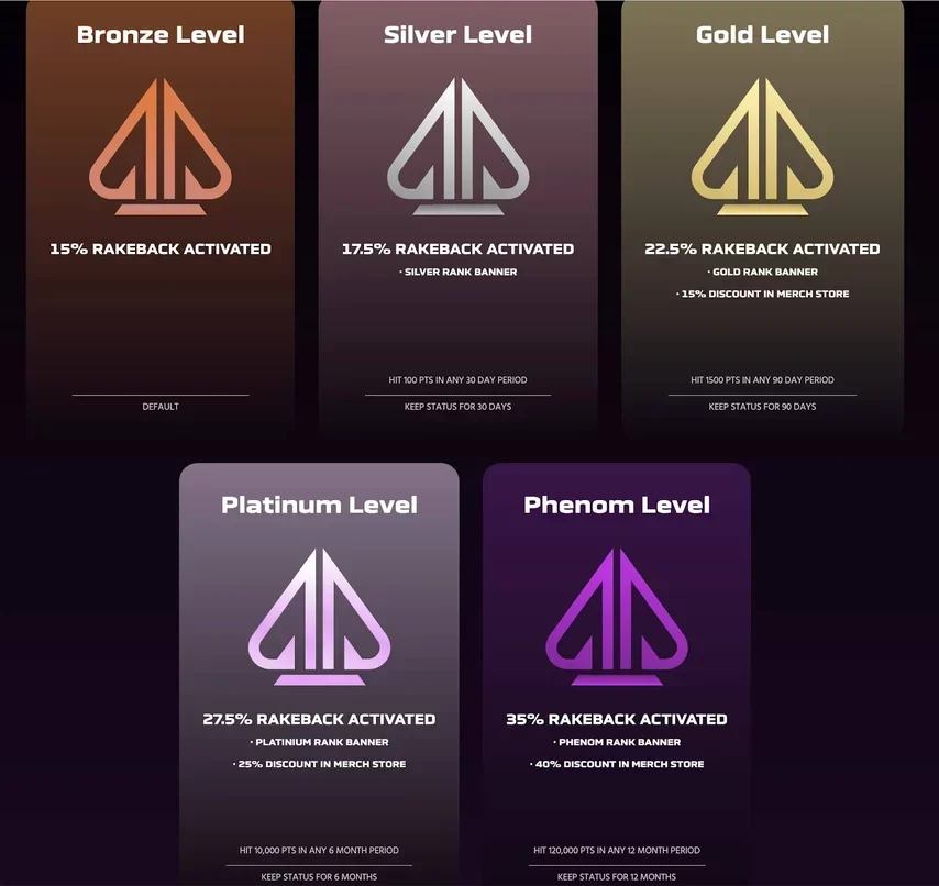 O sistema de rakeback do Phenom Poker é um dos principais atrativos para jogadores regulares. Oferecendo até 35% de rakeback, a plataforma recompensa os jogadores de acordo com sua frequência de jogo e nível de fidelidade — um percentual mais generoso que o de muitos outros sites. Essa taxa elevada de rakeback é especialmente interessante para grinders e jogadores profissionais, acumulando valores significativos ao longo do tempo.