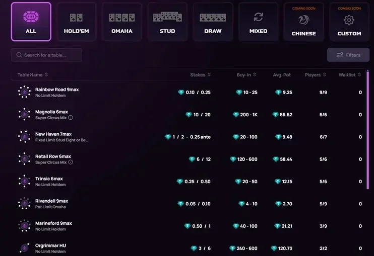 Atualmente, os jogos de cash dominam a plataforma, enquanto os torneios multi-mesas (MTTs), Sit & Go’s (SNGs) e o Poker Chinês (OFC) estão em desenvolvimento, com lançamento previsto para início de 2025.