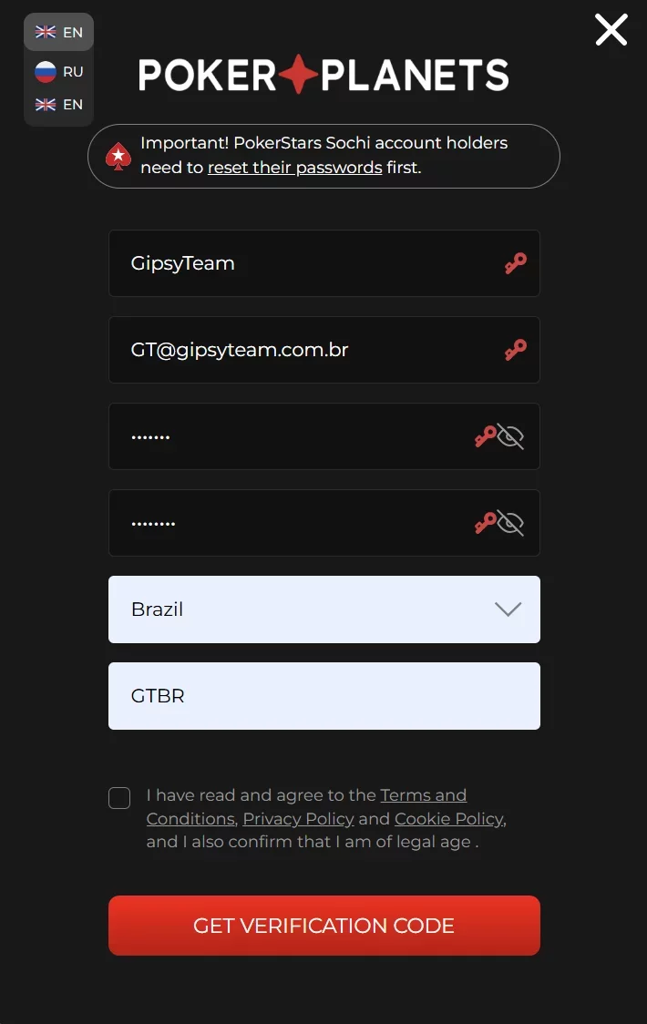 R: O código promocional para ter acesso a promoções únicas no PokerPlanets e no GipsyTeam é GTBR. Você deve usá-lo durante o registro.