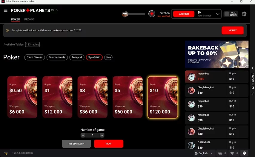 - Spin&Win (Jackpot Sit & Go): a seção Spin&Win oferece spins com buy-in de $0.50, $1, $3, $5 e $10. O maior prêmio possível, no nível mais caro, é de $120.000, sendo $96.000 para o campeão, $14.400 para o vice e $9.600 para o terceiro lugar. A chance de atingir o multiplicador máximo é de 2 em 10.000.000.