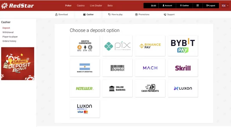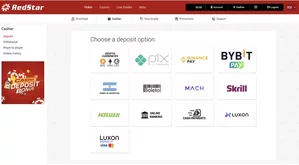 A RedStar Poker oferece diversos métodos de pagamento para que jogadores do Brasil possam depositar e sacar com comodidade.