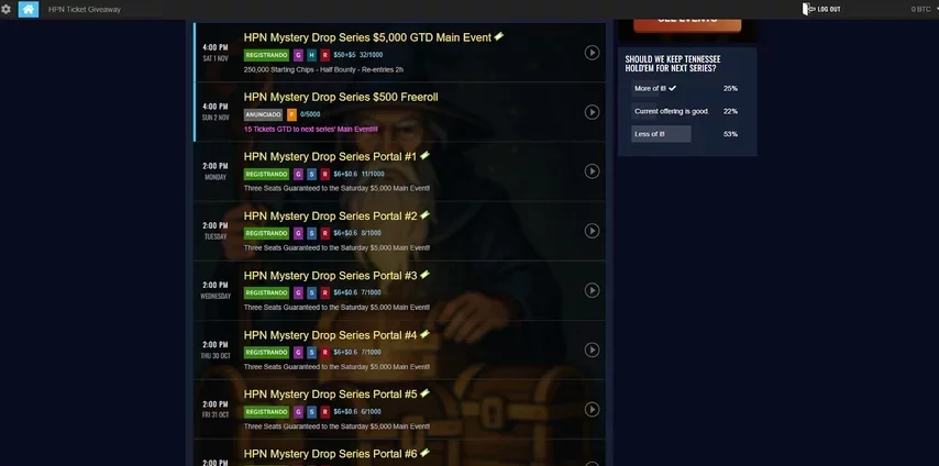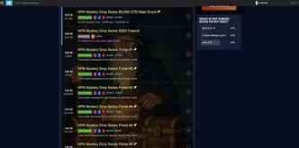 - MTTs (Multi-Table Tournaments): torneios multi-mesa com buy-ins destinado aos jogadores micro stakes. Atualmente, em 2025, o lobby de MTT tradicional (torneios programados) tem buy-in máximo de $5. No espaço eventos, a Mystery Series tem um Main Event de $55 com $5k GTD. Os outros torneios da aba eventos são satélites com buy-in de $6 e dão vaga para o Main Event.