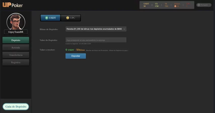 Todas as transações financeiras no UP Poker são feitas em USDT (Rede Tron, TRC20). Isso exige que o jogador tenha uma carteira de criptomoedas compatível. A vantagem é que depósitos são instantâneos e sem taxa extra do site (apenas a pequena taxa de rede do TRON). Os saques também são rápidos: geralmente concluídos em poucas horas ou até 24 horas, dependendo das confirmações na blockchain. É fundamental verificar duas vezes o endereço antes de enviar, pois transferências em crypto não podem ser revertidas.