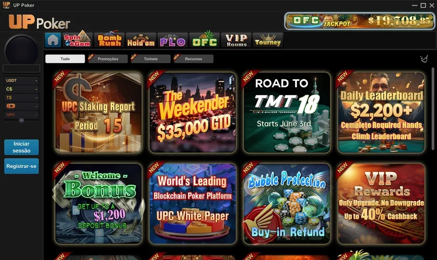 O UP Poker não aceita cartões de crédito, débito, transferências bancárias ou PIX. Somente criptomoedas são usadas. Esse modelo evita complicações com conversão de moeda ou recusa de transação por parte de bancos do Brasil e do mundo.