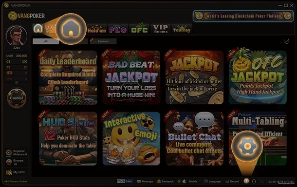 O software do VangPoker para computadores lembra uma versão simplificada do cliente da GGPoker. Uma diferença notável é que avatar, saldo e caixa ficam no lado esquerdo da tela — enquanto nas salas da rede Good Game ficam à direita.