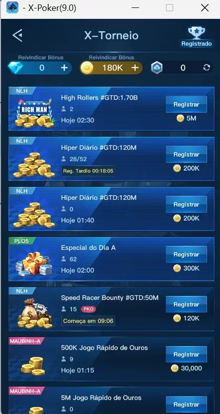 Em muitos clubes do X-Poker, o jogo começa nos limites NL10/PLO10. Por isso, o aplicativo X-Poker é adequado até para iniciantes com pequeno bankroll. A maior demanda aqui é por No-Limit Texas Hold’em e por várias modalidades de Omaha. Em alguns clubes há Short Deck e poker chinês (Open Face Chinese). Na maioria das comunidades fechadas, o limite mais procurado é o NL20. Quase em toda parte você encontrará 5 ou 6 mesas ativas nesses stakes. O pico de tráfego começa a cair no fim da tarde do Brasil.